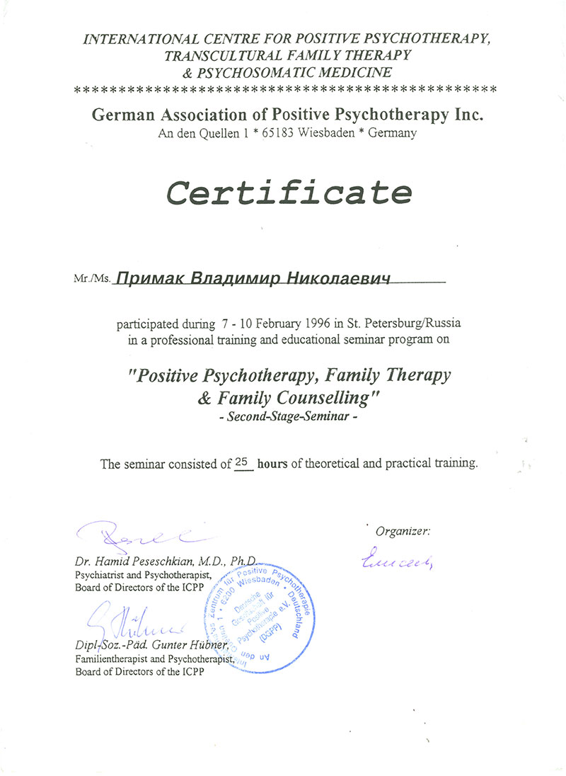 Индивидуальный член Европейской ассоциации психотерапевтов с 1998 г.