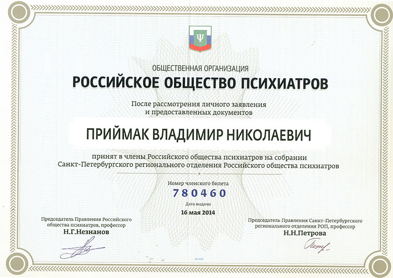 Состоит в обществе психиатров Российской Федерации со времени его создания.